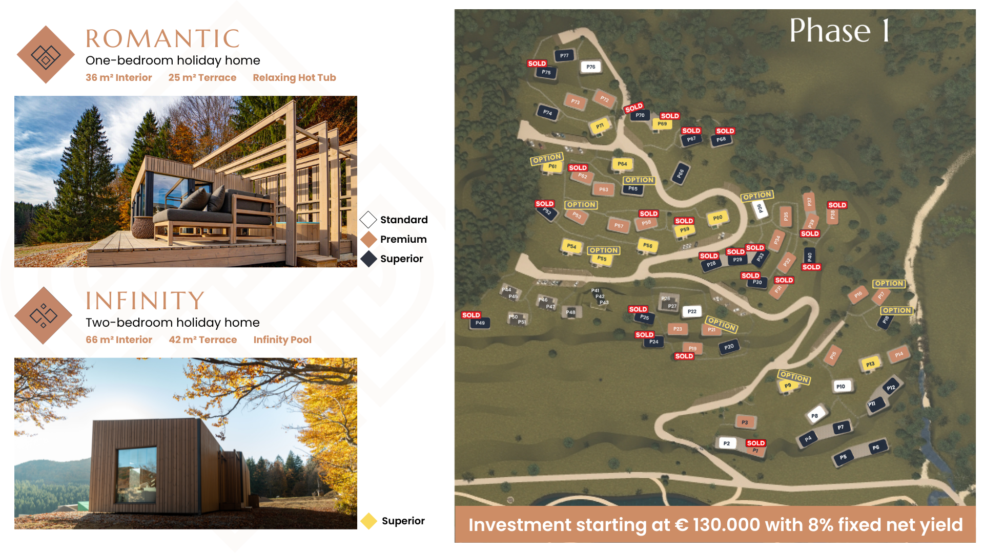Take a look at our resort map to see which premium holiday homes are still available for purchase. Each available property is clearly marked, offering you the chance to invest in your own slice of paradise. Review our selection and choose your ideal getaway in this exclusive setting.