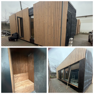 At the factory, two four-person houses are fully completed and ready for delivery.